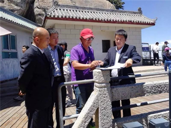 其實(shí),雷科峰平時(shí)對(duì)大家要求挺嚴(yán)的,職工背后議論說雷科峰有一種軍人作風(fēng),凌厲、硬氣,大家跟上他干事活多還辛苦。印象最深的是那一次美化南天門“三間房一頁(yè)瓦”附近的臺(tái)地??油莶黄降呐_(tái)地上原來蒙著一堆土,晴天一層灰,雨天滿地泥,冬天雪泥一凍一消,平臺(tái)就成了沼澤,不說過來過去行走不便,看起來也讓人不舒服,游客常常一不小心就濺得滿身的泥水,很掃興,雷科峰下決心美化平臺(tái)。美化平臺(tái)所用的沙子、石子、水泥要到二三里路遠(yuǎn)的溝底去背。從山頂?shù)綔系?,一路上全是立坡陡崖,雷科峰領(lǐng)著十幾名職工利用六天的工余時(shí)間,硬是把近二十噸的沙石背了上來。背料過程中,有的職工肩膀磨破了,有的雙腿像篩糠一樣抖個(gè)不停,許多職工中途不敢蹴下來休息,怕一蹴下就再也站不起來了,歇息時(shí)把沙袋子擱在路邊的石坎上,人站著緩口氣……一個(gè)個(gè)汗流浹背,氣喘吁吁。