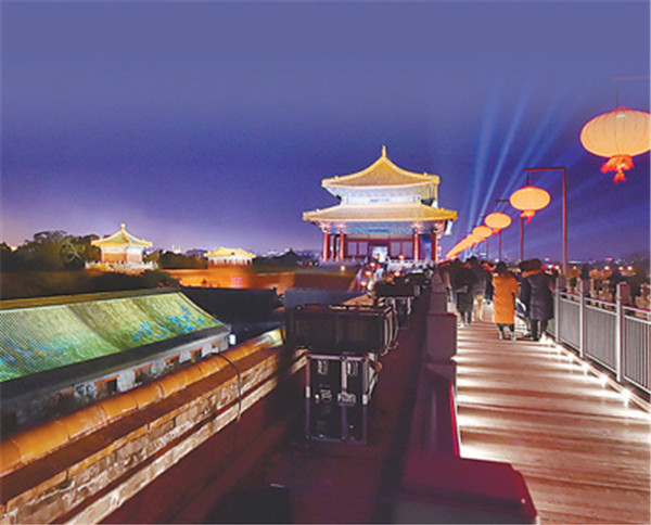 觀眾入場前,可觀賞午門城樓及東、西雁翅樓在燈光映照下的壯美雄姿。自午門入場后,首先觀賞點(diǎn)亮后的太和門廣場,隨后由午門西馬道登午門城樓,參觀“紫禁城里過大年”展覽,在東雁翅樓欣賞中央民族樂團(tuán)琵琶演奏家趙聰及其團(tuán)隊(duì)的演奏。結(jié)束午門展廳參觀后,觀眾沿著由紅燈籠點(diǎn)綴的城墻步行至東南角樓,觀看虛擬現(xiàn)實(shí)影片《角樓》,隨后來到東華門城樓,參觀“營造之道——紫禁城建筑藝術(shù)展”。當(dāng)走過近千米長的布滿紅燈籠的故宮東城墻時(shí),可以看到臨近城墻西側(cè)的部分古建筑也被點(diǎn)亮,聆聽暢音閣戲樓傳來的戲曲聲。到達(dá)東北角樓后,觀眾步行至神武門,在這一區(qū)域可以觀賞到城墻南北兩側(cè)通過藝術(shù)燈光投影于建筑屋頂上的《千里江山圖》等作品,從而產(chǎn)生人在畫中游的感覺。離開神武門城樓后,神武門外東、西兩側(cè)的角樓餐廳和角樓咖啡靜候光臨,從而結(jié)束此次“上元之夜”文化活動(dòng)。