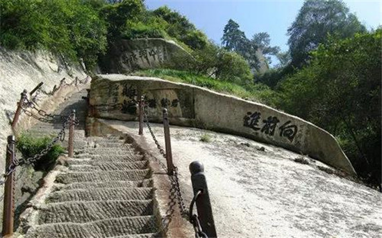 因嶺脊青黑,蜿蜓盤旋,就像蒼龍騰空,因而得名。嶺脊上、下高差約500米。在唐代以前,此路初通,僅鑿石窩,兩邊并未加欄,登嶺多是爬行,如騎龍背。到了明代,這里雖比唐代好些,但仍然很危險。解放后,1964年,將原嶺魚脊形鑿平加欄,1985年,又繼續(xù)下鑿,才將嶺道拓寬。現(xiàn)在游人至此便不覺有多危險了。