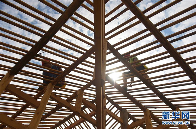 在湖北省宣恩縣曉關(guān)侗族鄉(xiāng),工人在建設(shè)吊腳樓(2018年7月26日攝)。2018年,當(dāng)?shù)卣_(kāi)始修建6座新的侗寨吊腳樓,為符合易地搬遷政策的貧困戶實(shí)施搬遷。新華社發(fā)(王俊 攝)