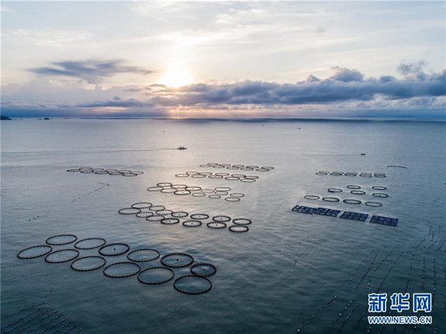 夕陽(yáng)映照下的浙江省溫州市平陽(yáng)縣南麂島馬祖岙海域,圓形的都是大黃魚(yú)養(yǎng)殖網(wǎng)箱(2018年8月18日無(wú)人機(jī)拍攝)。新華社記者 徐昱 攝