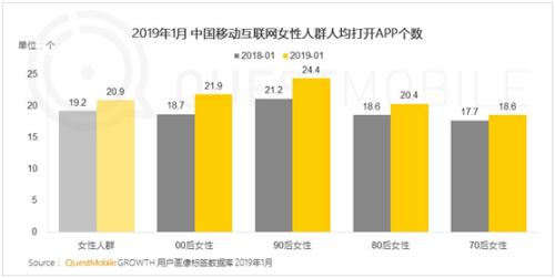 移動大數(shù)據(jù)平臺QuestMobile發(fā)布最新“她經(jīng)濟(jì)”洞察報告顯示,截至2019年1月,女性用戶人均打開APP個數(shù)達(dá)21個,高于移動互聯(lián)網(wǎng)的平均水平,主要為短視頻、綜合電商、社交等三類。
