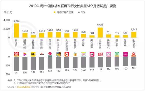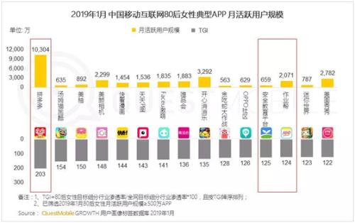 在拼多多、今日頭條、新浪微博、美顏相機(jī)及各類短視頻等女性最愛打開的20多個APP中,移動互聯(lián)網(wǎng)70和80后女性最愛使用的典型APP是新電商平臺拼多多,達(dá)到3240萬,TGI(Target Group Index,目標(biāo)群體指數(shù))高達(dá)80.5%,超過各類短視頻應(yīng)用。