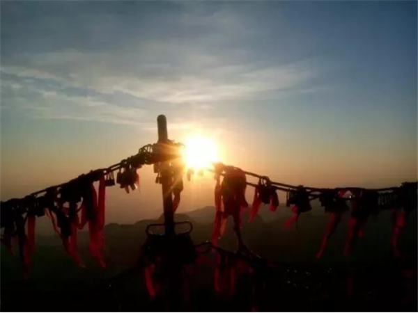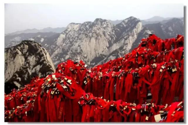 華山是一座愛情的殿堂,華山上的愛情故事悲烈、凄美而感人。我們曾經為世界上許許多多的愛情故事所感動。其實,發(fā)生在華山上的愛情故事一樣讓人的心情無法平靜。眾所周知的神話傳說《寶蓮燈》中,三圣母為了愛情,被二郎神巨石壓在華山頂上;弄玉為了愛情,逃離安逸的生活,與蕭史雙雙來到華山,琴瑟合鳴;漢臣王咸不畏艱險,到華山尋找賢妻南陽公主等等這些愛情故事,感天動地,流傳不衰,不知讓多少人為之贊嘆。也許是讓華山上這些動人的愛情故事所感染,不知從什么時候開始,在代表著堅實連接的一串串鐵鏈上,游人掛上了閃閃的金鎖,把矢志不渝的愛情鎖在華山上,在華山的見證下,祝愿自己的愛情如同華山一樣永遠不會改變。