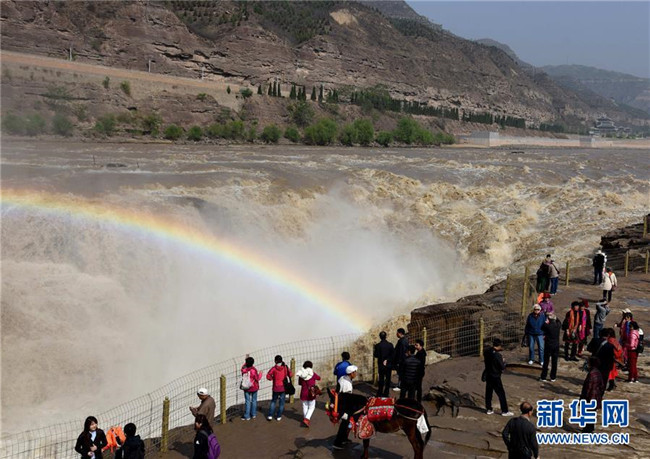 4月29日,游客在山西省臨汾市吉縣黃河壺口瀑布景區(qū)游覽。 近日,受上游降雨和水庫調(diào)節(jié)放水影響,晉陜交界的黃河壺口瀑布再現(xiàn)壯美瀑布群景觀。 新華社發(fā)(呂桂明攝)