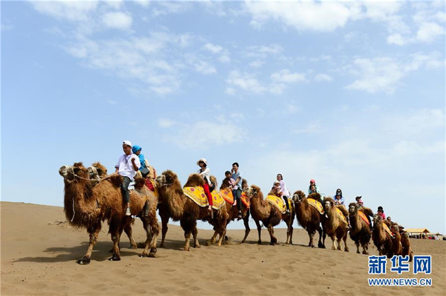 游客在新疆鄯善縣庫(kù)木塔格沙漠公園騎駱駝?dòng)斡[(5月2日攝)。 新華社發(fā)(丁磊攝)