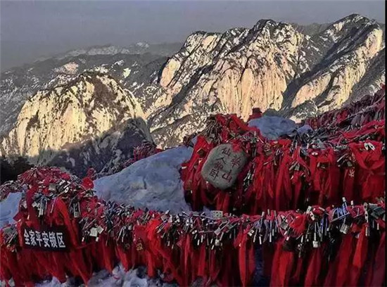 華山的金鎖關(guān)建在三峰口的一座石拱門處,關(guān)北接五云峰,南控華山主峰,東西兩側(cè)壑深千丈,是名副其實(shí)的咽喉要道。杜甫《望岳》詩中“箭栝通天有一門”指的就是這里。道家認(rèn)為,華岳為仙鄉(xiāng)神府,只有過了通天門,才算進(jìn)入仙境,所以便有“過了金鎖關(guān),另是一重天”的民謠。