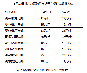 水產(chǎn)養(yǎng)殖網(wǎng)今早上傳的5月23日北京京深海鮮市場紅殼蝦青殼蝦批發(fā)價顯示,個頭最?。?-4錢/只)、最便宜的小龍蝦批發(fā)價僅需11元/斤,比昨天又降了1元。而湖南、江蘇、廣東等地的價格也和北京差不多,武漢甚至低至9元/斤。
