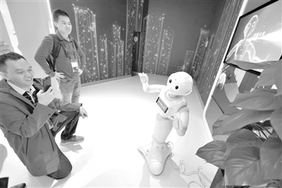 5月26日,參觀者在2019中國(guó)國(guó)際大數(shù)據(jù)產(chǎn)業(yè)博覽會(huì)上與5G+智能機(jī)器人進(jìn)行拍照互動(dòng)。記者 楊文斌 攝
