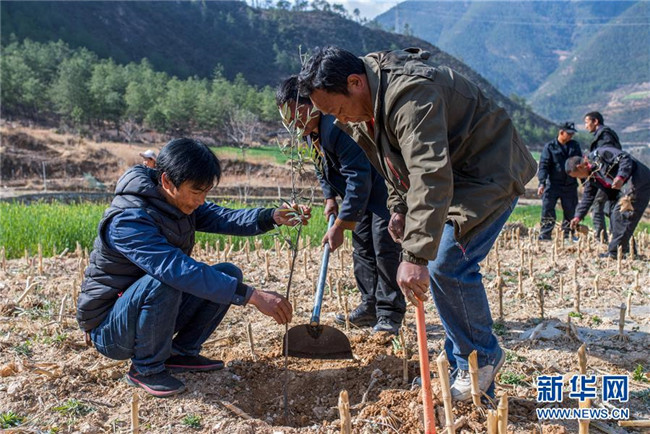 在云南香格里拉市五境鄉(xiāng),格茸(左)和“精準(zhǔn)扶貧感恩連”隊員在植樹(3月13日攝)。 新華社記者 胡超 攝