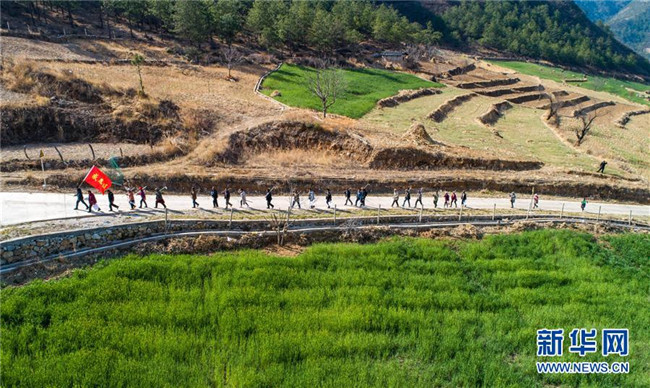 “精準(zhǔn)扶貧感恩連”在云南香格里拉市五境鄉(xiāng)開展植樹活動(3月13日無人機拍攝)。新華社記者 胡超 攝