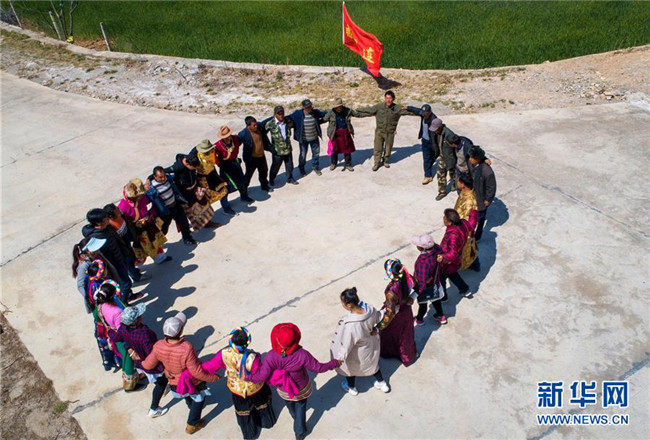 在云南香格里拉市五境鄉(xiāng),“精準(zhǔn)扶貧感恩連”隊員在跳鍋莊(3月13日無人機拍攝)。新華社記者 胡超 攝