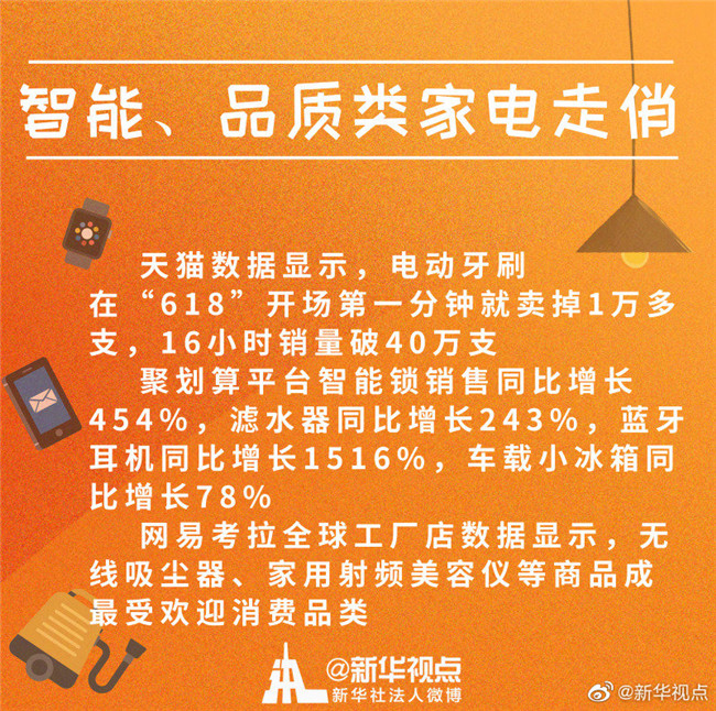 除了滿足“剛需”的大家電,提升生活品質(zhì)的小家電也十分走俏。天貓數(shù)據(jù)顯示,電動(dòng)牙刷在“618”開(kāi)場(chǎng)第一分鐘就賣(mài)掉1萬(wàn)多支,16小時(shí)銷量破40萬(wàn)支。聚劃算平臺(tái)智能鎖銷售額同比增長(zhǎng)454%,濾水器同比增長(zhǎng)243%,藍(lán)牙耳機(jī)同比增長(zhǎng)1516%,車(chē)載小冰箱同比增長(zhǎng)78%。在網(wǎng)易考拉全球工廠店,無(wú)線吸塵器、家用射頻美容儀等商品成最受歡迎消費(fèi)品類。