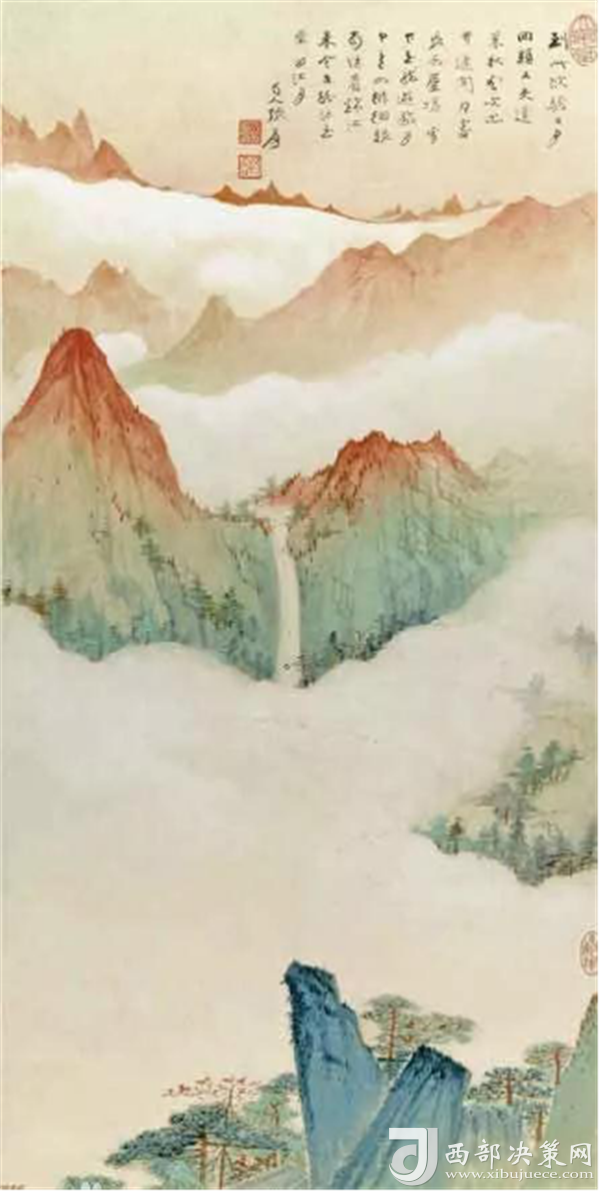 《華山云海》這幅山水畫是由中國(guó)著名山水畫家張大千先生創(chuàng)作,該幅山水畫作品圖也是畫家作品當(dāng)中出類撥萃的的精品之一,描繪了華山旭日東升的云海。