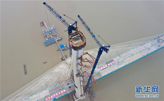 當(dāng)日,滬通長(zhǎng)江大橋南主塔順利封頂。至此,該橋兩座高達(dá)330米的主塔全部建成,標(biāo)志著世界最大跨度公鐵兩用斜拉橋建設(shè)取得了關(guān)鍵性進(jìn)展。滬通長(zhǎng)江大橋全長(zhǎng)11072米,主橋長(zhǎng)2296米,主跨1092米,是滬通鐵路全線的控制性工程,設(shè)計(jì)為上層6車道高速公路,下層4線鐵路。新華社發(fā)(許叢軍攝)