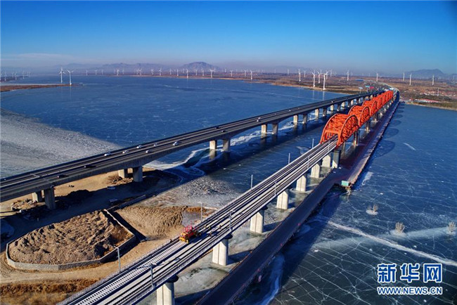 中鐵三局工人在河北張家口京張高鐵官?gòu)d水庫特大橋進(jìn)行鋪軌作業(yè)(1月13日無人機(jī)拍攝)。新華社記者 楊世堯 攝