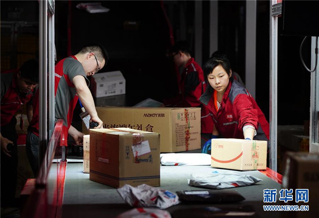 工人在位于西安的京東智能物流中心細(xì)分區(qū)龍門架下整理包裹(6月3日攝)。龍門架掃描后,包裹的出庫物流信息將自動(dòng)更新。新華社記者 邵瑞 攝