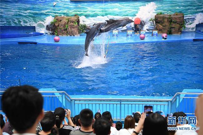 7月10日,游客在海洋世界觀看動物表演。新華社發(fā)