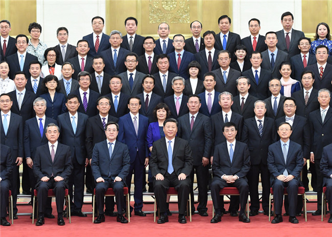 7月17日,黨和國家領導人習近平、王滬寧等在北京人民大會堂會見回國參加2019年度駐外使節(jié)工作會議的全體使節(jié)。 新華社記者 張領 攝