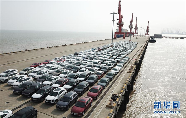 在位于上海臨港的上海南港碼頭,新出廠的汽車等待裝船轉運(6月27日無人機拍攝)。 新華社記者 方喆 攝