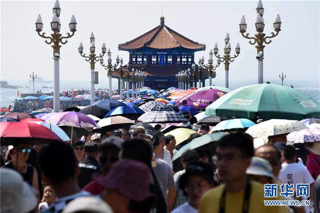 8月6日,游客在青島棧橋景區(qū)游玩。 暑期旅游旺季,海濱城市青島各景區(qū)、景點游人如織。 新華社記者 李紫恒 攝