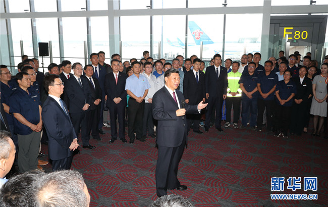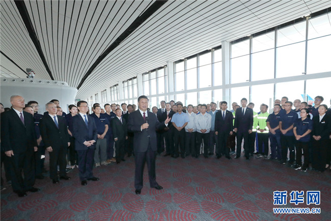 大興機(jī)場(chǎng)航站樓,是目前全球最大規(guī)模的單體航站樓,以其獨(dú)特的造型設(shè)計(jì)、精湛的施工工藝、便捷的交通組織、先進(jìn)的技術(shù)應(yīng)用,創(chuàng)造了許多世界之最。航站樓里,流線型的空間結(jié)構(gòu)十分寬敞明亮。習(xí)近平步行巡覽站臺(tái)大廳和值機(jī)大廳,實(shí)地了解值機(jī)、安檢、登機(jī)和殘疾人無(wú)障礙設(shè)施等情況,并結(jié)合沙盤和模型聽(tīng)取機(jī)場(chǎng)總體規(guī)劃、設(shè)施建設(shè)等介紹。習(xí)近平強(qiáng)調(diào),大興國(guó)際機(jī)場(chǎng)是首都的重大標(biāo)志性工程,是推動(dòng)京津冀協(xié)同發(fā)展的骨干工程。京津冀三地要抓住機(jī)遇加強(qiáng)協(xié)同合作,加快推動(dòng)地區(qū)高質(zhì)量發(fā)展。民航業(yè)是國(guó)家重要的戰(zhàn)略產(chǎn)業(yè)。要建設(shè)更多更先進(jìn)的航空樞紐、更完善的綜合交通運(yùn)輸系統(tǒng),加快建設(shè)交通強(qiáng)國(guó)。