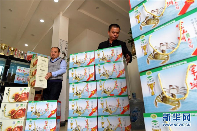 在江西省進(jìn)賢縣軍山湖大閘蟹線上銷售網(wǎng)點(diǎn),工作人員準(zhǔn)備將裝箱的大閘蟹發(fā)貨給網(wǎng)購(gòu)的顧客(2018年11月9日攝)。新華社記者 彭昭之 攝