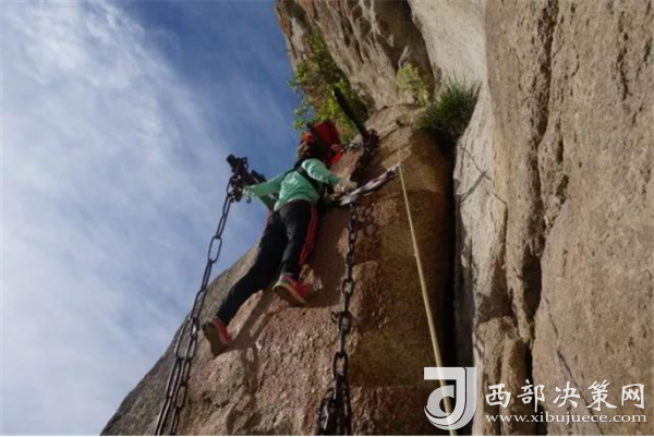 鷂子翻身:“鷂子翻身”在華山東峰,是通往華山著名景點(diǎn)—宋代開國皇帝趙匡胤和陳摶老祖博弈之處的必經(jīng)之險(xiǎn)道。其路鑿于倒坎懸崖上,只見鐵索寒瑟,紫霧繚繞,云瀑倥傯,鷹鷂哀鳴,四周景色絕佳、就是難覓行徑。游人至此,須面壁挽索,伸腳探尋石窩,交替而下。
