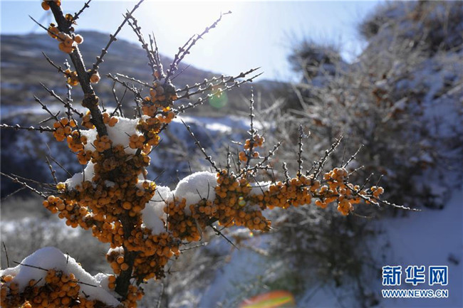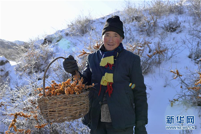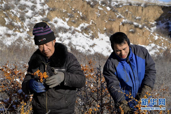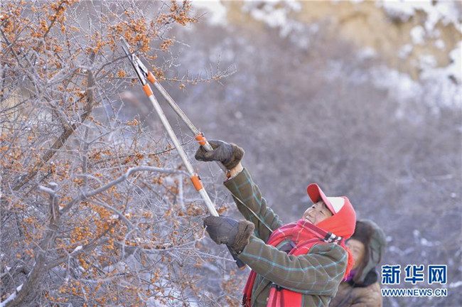 12月18日,當(dāng)?shù)厝罕娫谇逅涌h野生沙棘保護地采摘沙棘果。 新華社記者 徐欽 攝