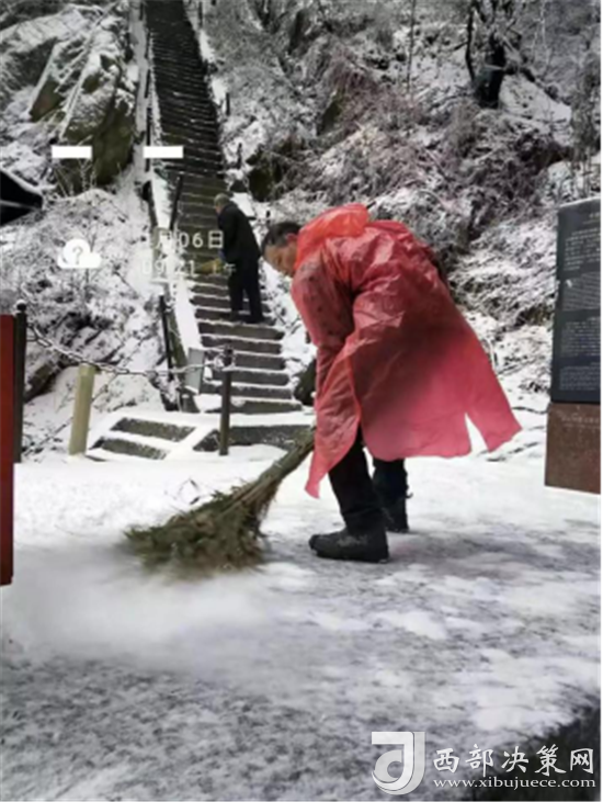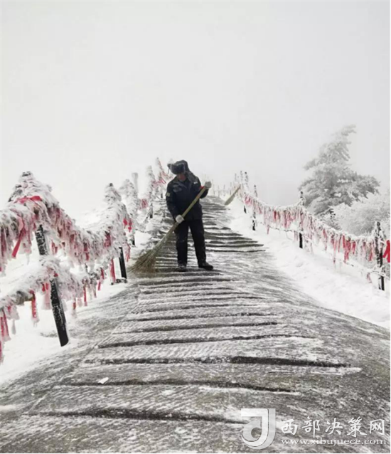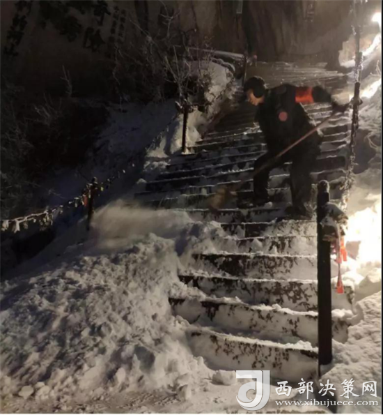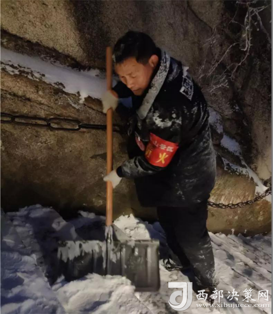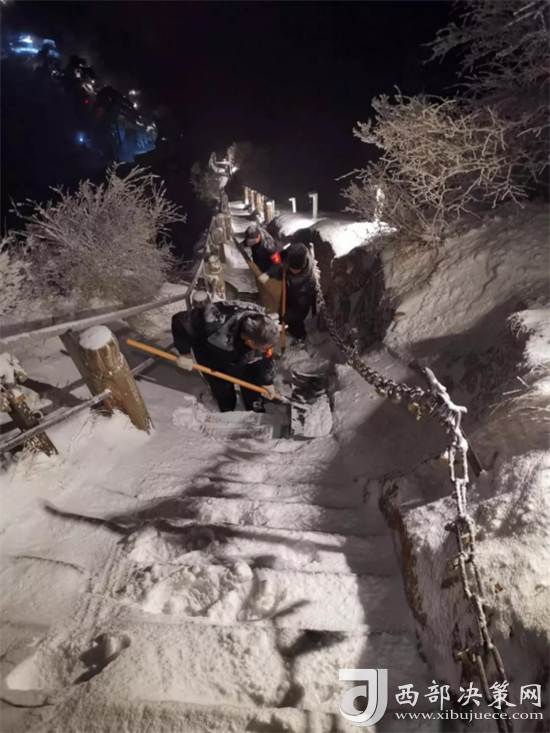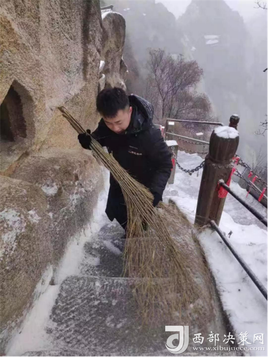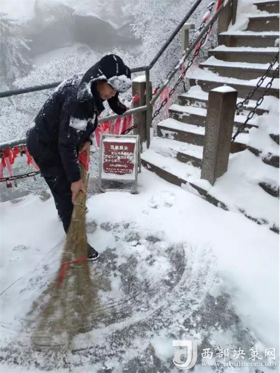 清晨天亮后,工作人員以常態(tài)化的工作要求持續(xù)對(duì)道路積雪進(jìn)行細(xì)化清掃,防止路面結(jié)冰,發(fā)生安全事故。(供稿:華山景區(qū)管理公司)