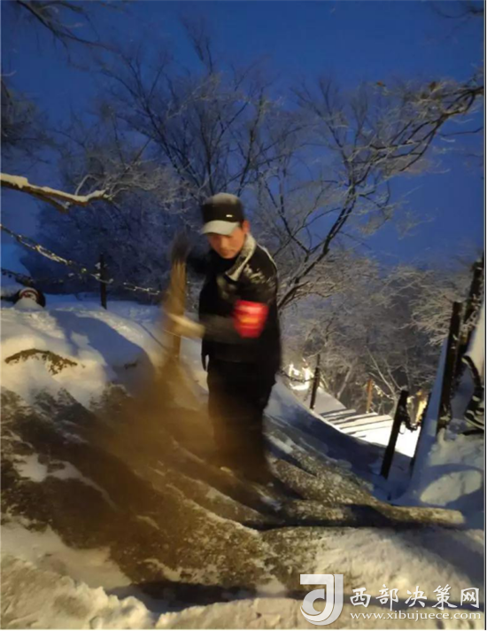 我們的工作人員不畏天寒地凍,在大雪里默默堅(jiān)守在一線,大雪浸濕了衣襟也不為所動(dòng),用自己手中的“畫筆”為游客“畫出”一條安全暢通的景觀道路,他們擾動(dòng)了那一份美景,為的卻是給游客更多的安全。
