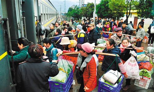 ▲停靠在湖南省麻陽郭公坪站的7272次列車,當(dāng)?shù)毓r(nóng)菜農(nóng)挑著擔(dān)子準(zhǔn)備上車。這趟“慢火車”所經(jīng)過的地區(qū)多為“老少邊窮”,經(jīng)濟欠發(fā)達。為盤活沿途百姓致富渠道,鐵路部門開“綠燈”允許乘客攜帶大量鮮活貨物乘車。