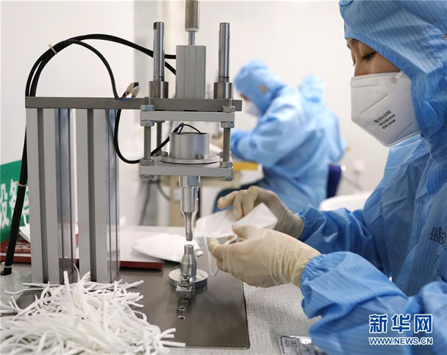 沈陽盛實(shí)醫(yī)療科技有限公司工人在為醫(yī)用防護(hù)級N95口罩焊接耳套(2月8日攝)。 新華社記者 姚劍鋒 攝