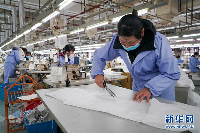工作人員在江蘇紅豆集團(tuán)一般性防護(hù)服生產(chǎn)線上作業(yè)(2月8日攝)。 新華社記者 李博 攝