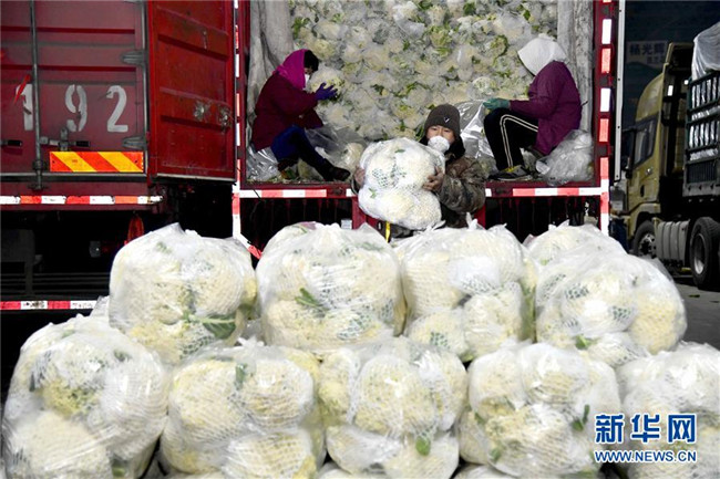 2月1日,在山東省壽光農(nóng)產(chǎn)品物流園,菜農(nóng)搬運(yùn)蔬菜以保障新冠肺炎疫情防控期間蔬菜供應(yīng)。新華社記者 郭緒雷 攝
