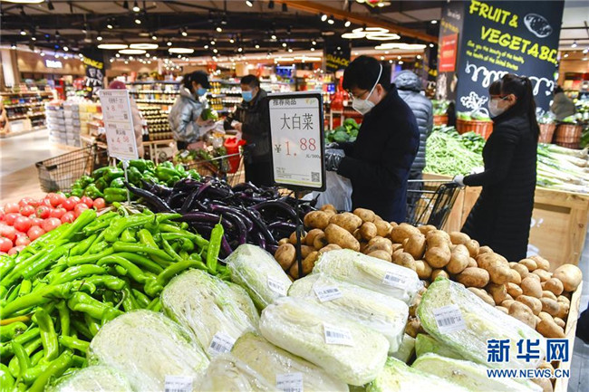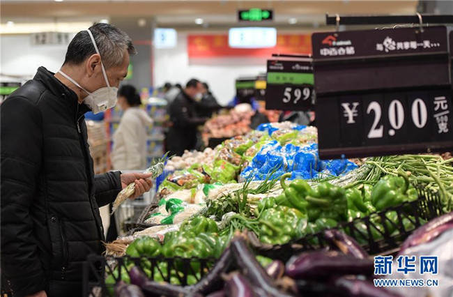 2月10日,顧客在湖北省武漢市江漢區(qū)中百倉(cāng)儲(chǔ)超市北湖購(gòu)物廣場(chǎng)店選購(gòu)低價(jià)蔬菜。 新華社記者 李賀 攝