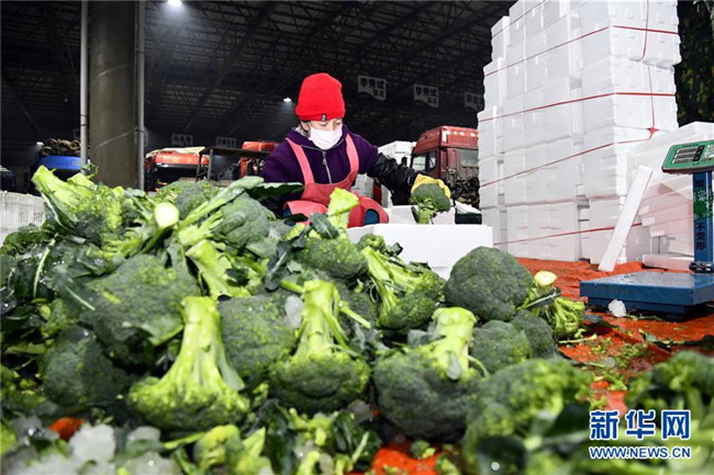 2月1日,在山東省壽光農(nóng)產(chǎn)品物流園,菜農(nóng)整理裝箱蔬菜以保障新冠肺炎疫情防控期間蔬菜供應(yīng)。新華社記者 郭緒雷 攝