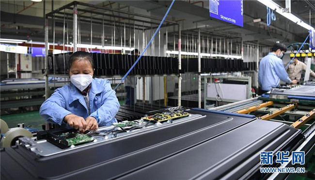 在位于廣州開發(fā)區(qū)的廣州創(chuàng)維平面顯示科技有限公司生產(chǎn)車間內(nèi),工人們在流水線上作業(yè)(2月10日攝)。新華社記者 鄧華 攝