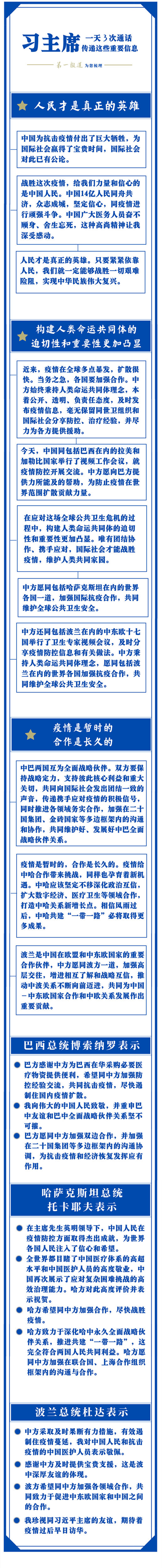 頻密互動,高效溝通。習(xí)主席通話內(nèi)容信息量很大:介紹中國抗疫努力,深化國際抗疫合作,推動雙邊關(guān)系發(fā)展……其中,“合作”與“人類命運共同體”是習(xí)主席反復(fù)提到的關(guān)鍵詞。