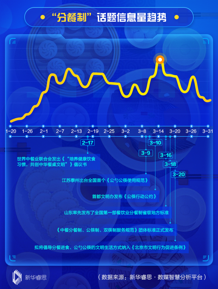 根據(jù)新華睿思·數(shù)媒智慧分析平臺數(shù)據(jù)顯示,在最近兩個月來,關于分餐制話題的關注度不斷上升,全國范圍內信息量累計達到1039539條。其中,從話題趨勢演變圖看,3月14日達到輿論熱度的首個峰值(30183條),這與北京、江蘇泰州等地發(fā)布出臺關于公筷使用的文件直接相關。