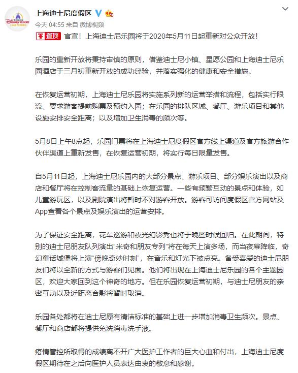 據(jù)上海迪士尼度假區(qū)官方微博消息,上海迪士尼樂園將于2020年5月11日起重新對公眾開放。在恢復(fù)運(yùn)營初期,上海迪士尼樂園將實(shí)施系列新的運(yùn)營舉措和流程,包括實(shí)行限流、要求游客提前購票及預(yù)約入園,在樂園的排隊(duì)區(qū)域、餐廳、游樂項(xiàng)目和其他設(shè)施安排安全距離,以及增加衛(wèi)生消毒的頻次等。