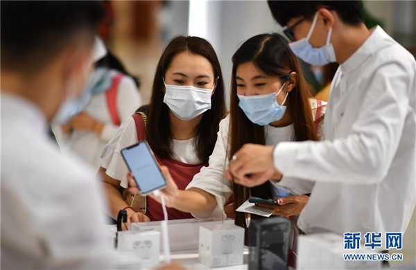 7月1日,顧客在??谌赵聫V場免稅店選購手機等電子消費產(chǎn)品。當(dāng)日,海南開始實施調(diào)整后的離島免稅購物政策。海南離島旅客每年每人免稅購物額度提高至10萬元,電子消費產(chǎn)品等7類新增商品開售。新華社記者郭程攝