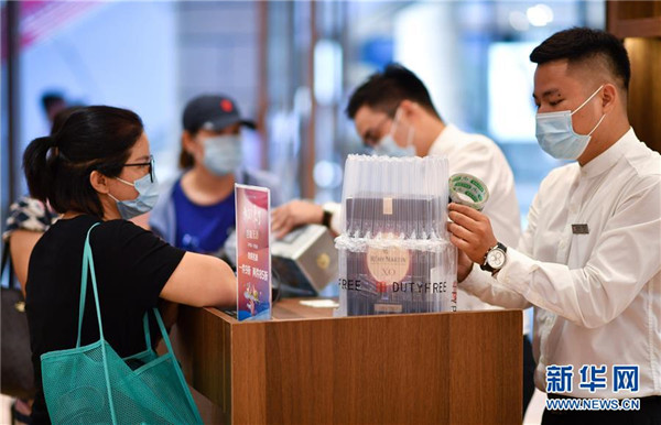 7月1日,??谌赵聫V場免稅店的工作人員為顧客打包酒類商品。當(dāng)日,海南開始實施調(diào)整后的離島免稅購物政策。海南離島旅客每年每人免稅購物額度提高至10萬元,電子消費產(chǎn)品等7類新增商品開售。新華社記者郭程攝
