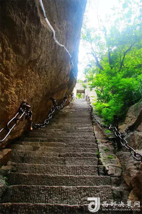 玉泉院出發(fā)直上到達華山門(步行登山路入口)。徒步經(jīng)五里關(guān)、莎蘿萍、毛女洞、青柯萍、回心石、千尺幛、百尺峽、群仙觀、老君犁溝后,到達北峰。全長約6公里,耗時3小時左右。