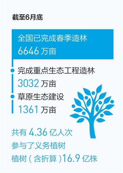 記者從國家林業(yè)和草原局獲悉:今年上半年,全國綠化委員會、國家林業(yè)和草原局科學(xué)指導(dǎo)各地各部門在做好疫情防控的同時積極有序開展春季造林綠化。截至6月底,全國已完成春季造林6646萬畝,占全年造林任務(wù)的65.8%;完成重點生態(tài)工程造林3032萬畝、草原生態(tài)建設(shè)1361萬畝。共有4.36億人次參與了義務(wù)植樹,植樹(含折算)16.9億株。