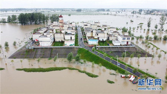 這是被洪水包圍的安徽省阜南縣曹集鎮(zhèn)西田坡莊臺,蓄洪區(qū)內(nèi)的所有莊臺上都有黨員干部值守(7月24日攝,無人機(jī)照片)。 新華社記者 張端 攝