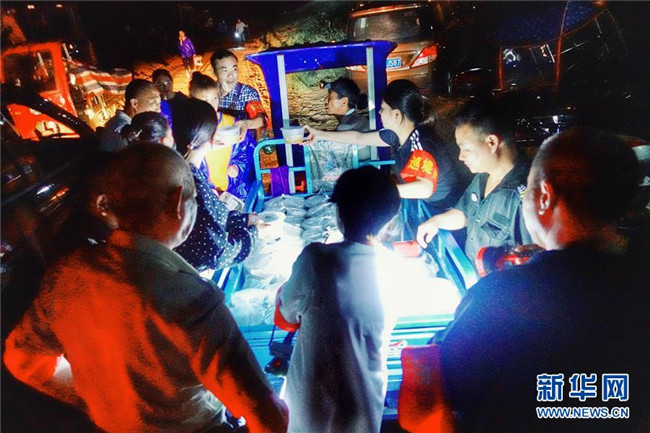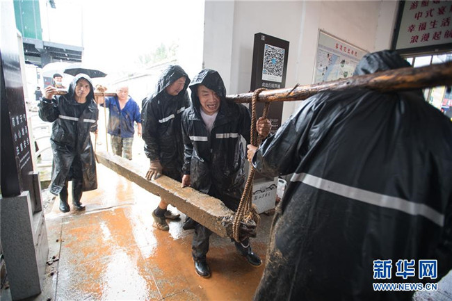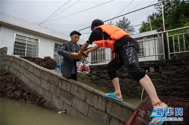 7月7日,湖南省常德市石門縣雁池鄉(xiāng)重福橋村的干部(右)為被困群眾運送生活物資。 新華社記者 陳思汗 攝