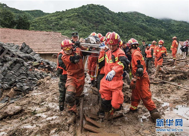 7月8日,在湖北黃岡市黃梅縣袁山村山體滑坡現(xiàn)場,救援人員轉(zhuǎn)移救出的年過八旬的老人。 新華社記者 肖藝九 攝