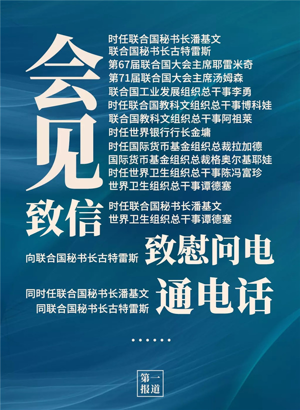 2013年以來,習(xí)主席通過會見、通話、致信函等多種方式同聯(lián)合國主要官員保持密切溝通?;訉ο蟀?lián)合國秘書長、聯(lián)合國大會主席,還有聯(lián)合國工業(yè)發(fā)展組織、聯(lián)合國教科文組織、世界銀行、國際貨幣基金組織、世界衛(wèi)生組織等聯(lián)合國專門機構(gòu)主要負(fù)責(zé)人。
