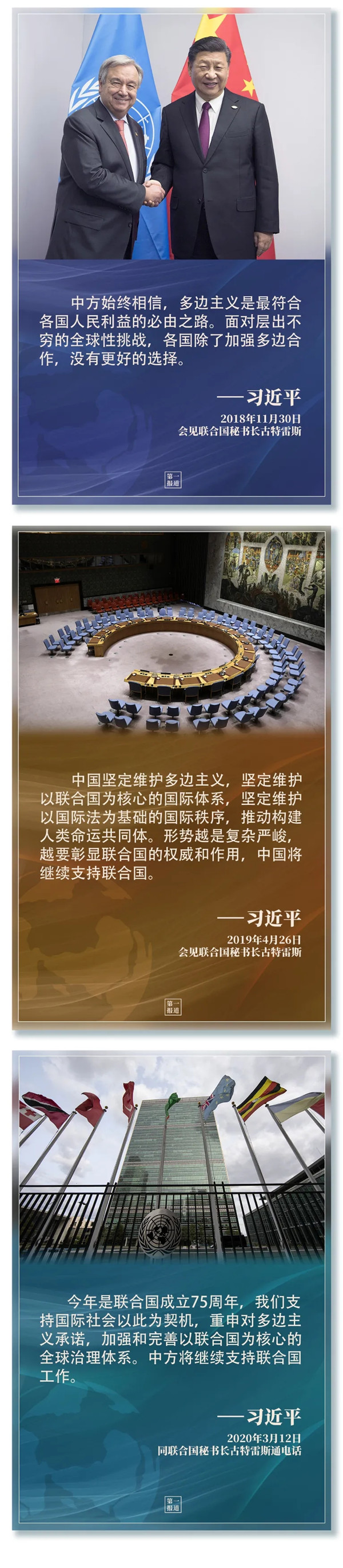習(xí)主席指出,“支持聯(lián)合國發(fā)揮作用,維護(hù)聯(lián)合國權(quán)威和地位,是中國外交一項基本政策。”2013年以來,習(xí)主席多次會見聯(lián)合國主要官員,訪問聯(lián)合國總部及聯(lián)合國專門機構(gòu),出席一系列聯(lián)合國活動……親自推動中國同聯(lián)合國的合作,發(fā)出支持聯(lián)合國事業(yè)、捍衛(wèi)多邊主義的中國強音。